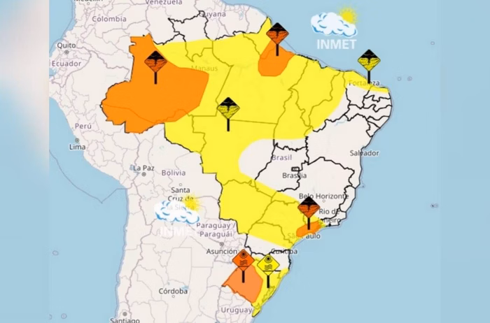 Além dos avisos para ondas de calor, o Inmet emitiu cinco alertas para tempestades, sendo três de cor laranja, o que representa “perigo”, e outros dois de coloração amarela, que apontam para o “perigo potencial” das chuvas.
