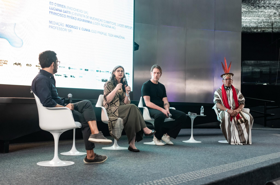 Os outros participantes da mesa foram Luciana Gatti, cientista que estuda mudanças climáticas e coordenadora do Laboratório de Gases do Efeito Estufa, e do guitarrista da banda britânica de rock alternativo Radiohead, Ed O’Brien, sendo mediada por Rodrigo V. Cunha, líder e curador do TEDx Amazônia.