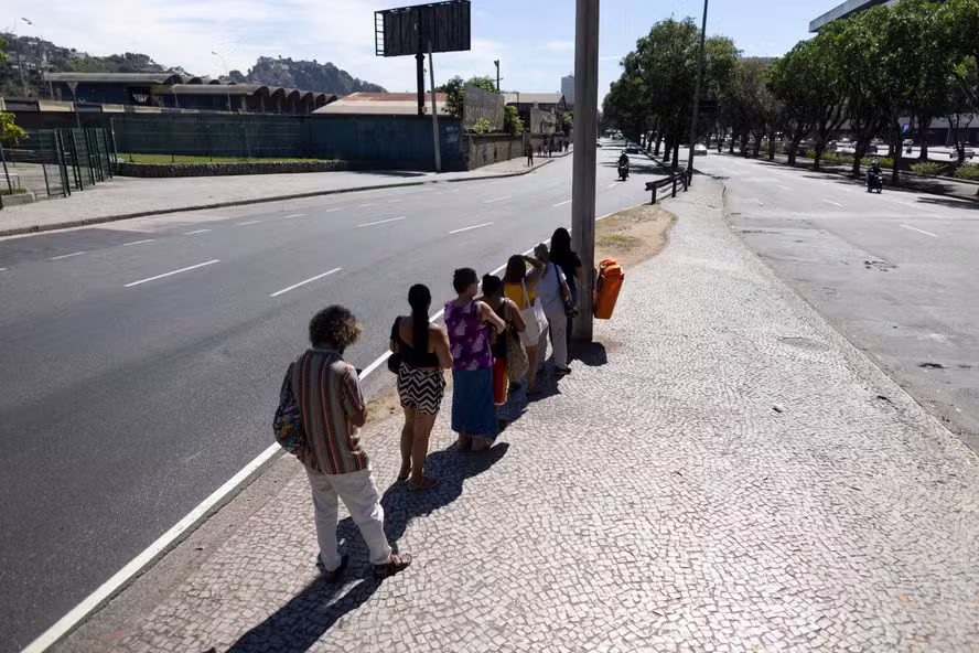 Onda de calor atinge o Rio de Janeiro. Na foto, passageiros procuram se proteger do sol quente na sombra de um poste em ponto de ônibus da Avenida Presidente Vargas, na Cidade Nova — Foto: Márcia Foletto / Agência O Globo