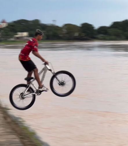 Um vídeo compartilhado nas redes sociais nesta terça-feira (18) mostra um jovem realizando uma manobra arriscada ao se jogar com uma bicicleta no Rio Acre. As imagens, publicadas por Felipe Ramon, mostram ele pedalando em alta velocidade antes de se lançar nas águas, enquanto pessoas no local reagem assustadas.