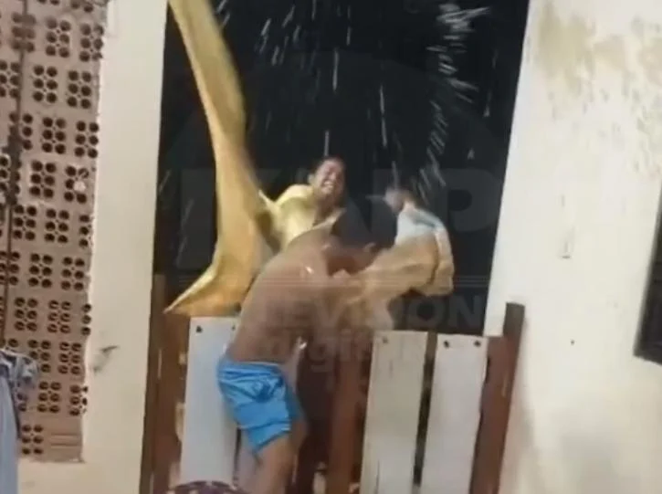 Nas imagens, é possível ver o momento do confronto entre ela e o homem. Ele, que aparentemente está na porta de casa, é atacado pela mulher, que joga gasolina sobre a vítima.