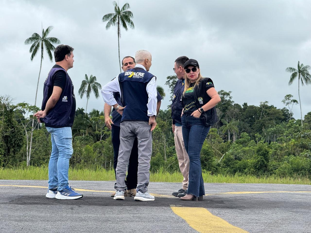 Durante a agenda, a presidente do Deracre, Sula Ximenes, também realizou uma vistoria preliminar no aeródromo de Feijó, acompanhada do diretor de Portos e Aeroportos, Sócrates Guimarães. Ela explicou que o Deracre irá realizar as intervenções necessárias na pista de pouso e na sede do aeródromo, atendendo as determinações da Agência Nacional de Aviação Civil (Anac), que exige inspeções periódicas para garantir a segurança operacional.