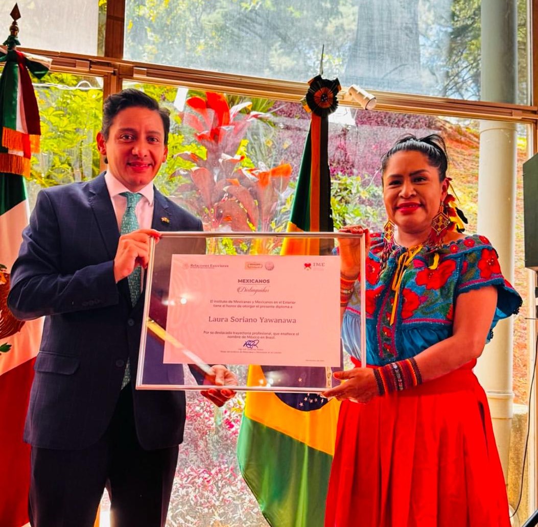 No dia 19 de fevereiro, a indígena Laura Yawanawa recebeu a honraria “Mexicanos Distinguidos” do Instituto de Mexicanas e Mexicanos no Exterior, em reconhecimento ao seu trabalho em fortalecer as relações entre comunidades indígenas do Brasil e do México. A cerimônia, que ocorreu na Embaixada do México em Brasília, celebrou a dedicação de Laura em promover a interconexão cultural e social entre esses povos.