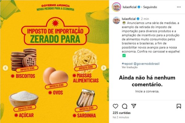 “Anunciamos uma série de medidas, a exemplo da retirada de imposto de importação para diversos produtos e a ampliação de incentivos para a produção de alimentos muito consumidos pelos brasileiros e brasileiras, a fim de possibilitar novos avanços para a nossa economia”, escreveu o petista.