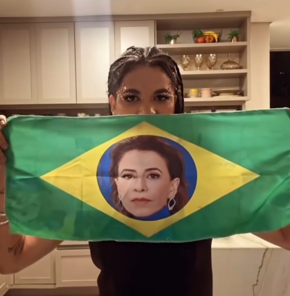 Jessica Ingrede declara torcida para Fernanda Torres no Oscar com bandeira do Brasil. Foto: Reprodução