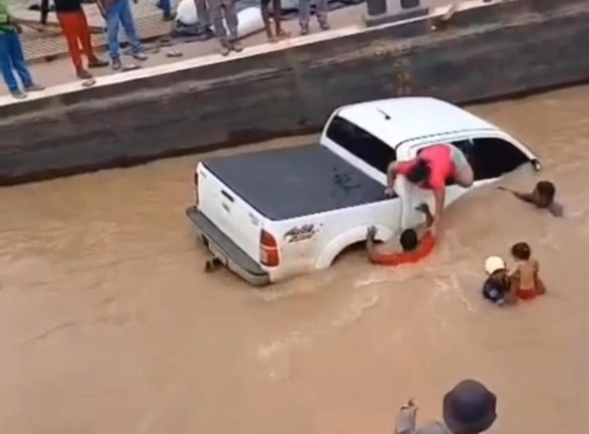 Uma mulher e uma criança estavam no carro no momento do incidente e foram salvas a tempo de uma possível tragédia. Ao ver a cena, homens pularam imediatamente na água para ajudar a retirar os dois ocupantes do veículo.