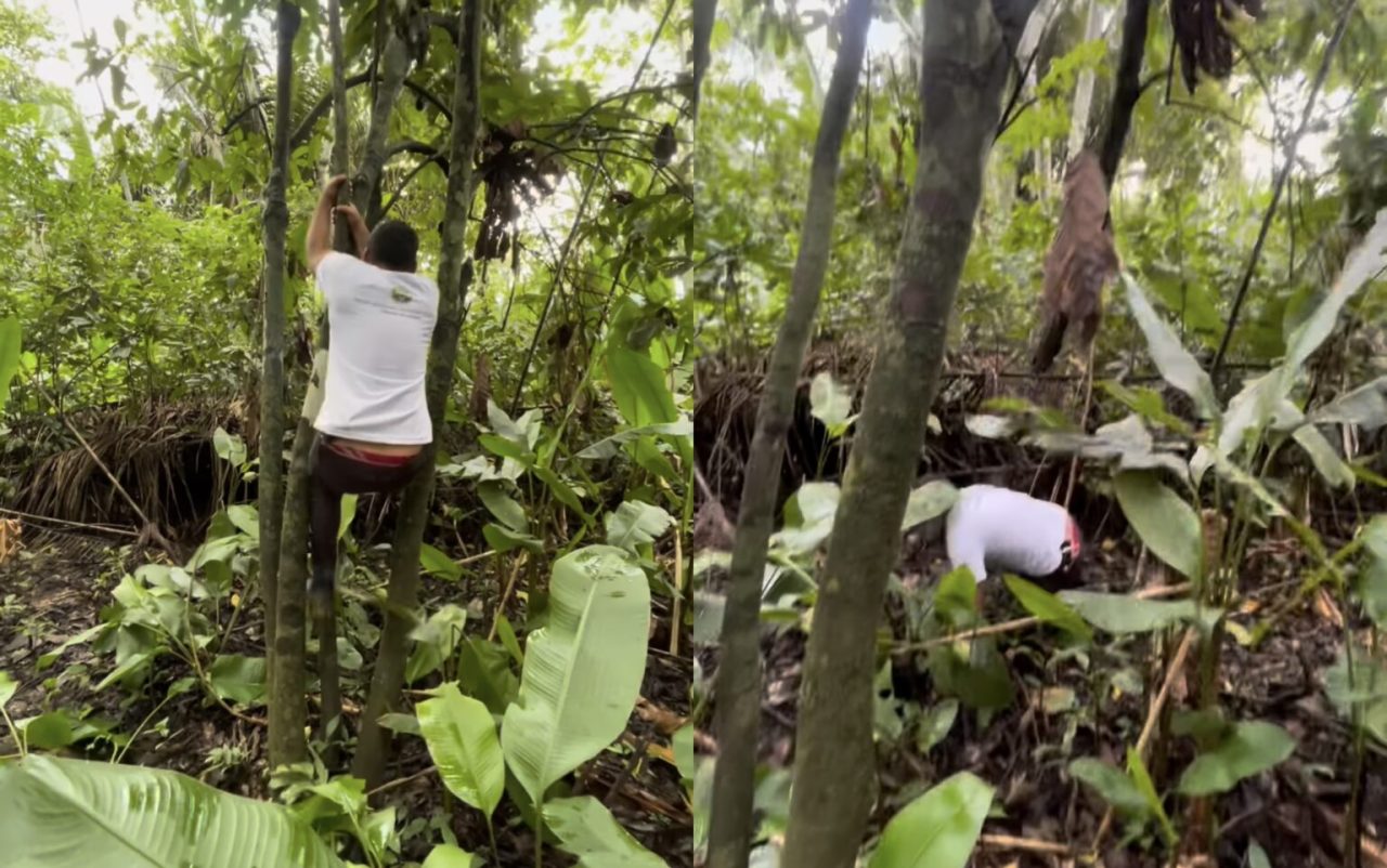 Enquanto explicava a relevância do cacau na alimentação no contexto da floresta, Eudes mencionou que ainda não havia se alimentado naquele dia e expressou sua intenção de colher um fruto para ganhar energia. “Hoje ainda não comi, então vou pegar um cacau para comer e ficar forte, para lidar com o gado”, disse ele antes de iniciar sua escalada.