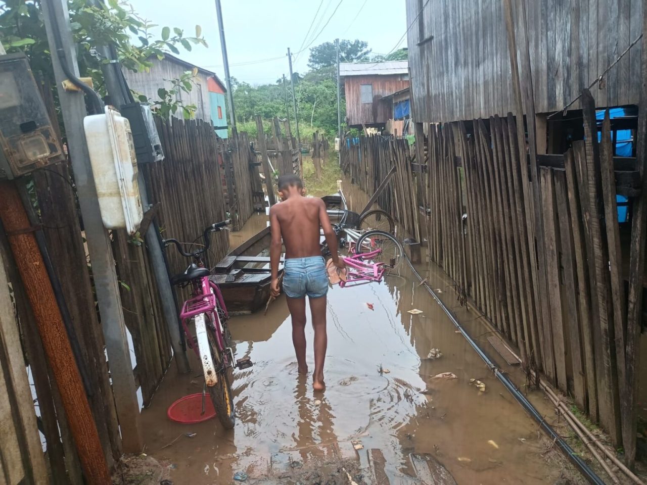 Por enquanto, ainda não há famílias desabrigadas, mas a água já está chegando em algumas casas localizadas no bairro Praia do Amarílio. Vários quintais foram atingidos e, em algumas situações, os moradores precisam utilizar barcos para sair de casa.