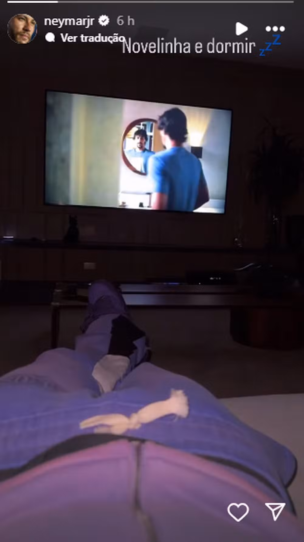 Neymar, de 33 anos, mostrou que terminou a noite sozinho e tranquilo após ver seu nome envolvido em uma nova polêmica. Deitado no escuro de blusa, calça e tênis, o jogador de futebol filmou sua televisão e escreveu: “Novelinha e dormir”. O post foi feito na madrugada desta sexta-feira (14). Já Bruna Biancardi, namorada do atleta, fez publicações mostrando que curtiu uma noite de garotas.