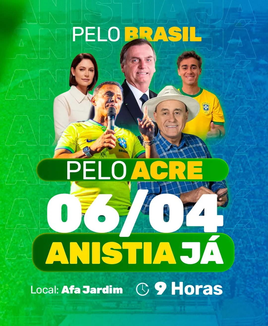 De um lado, lideranças políticas ligadas ao ex-presidente Jair Bolsonaro estão à frente de um ato no buffet Afa Jardim, marcado para as 9h da manhã. A divulgação do evento traz imagens do ex-presidente e de figuras políticas locais, mobilizando apoiadores para a causa da anistia. O evento contará com a presença do senador Márcio Bittar, do prefeito de Rio Branco, Tião Bocalom, e do secretário de assistência social de Rio Branco, João Marcos Luz.