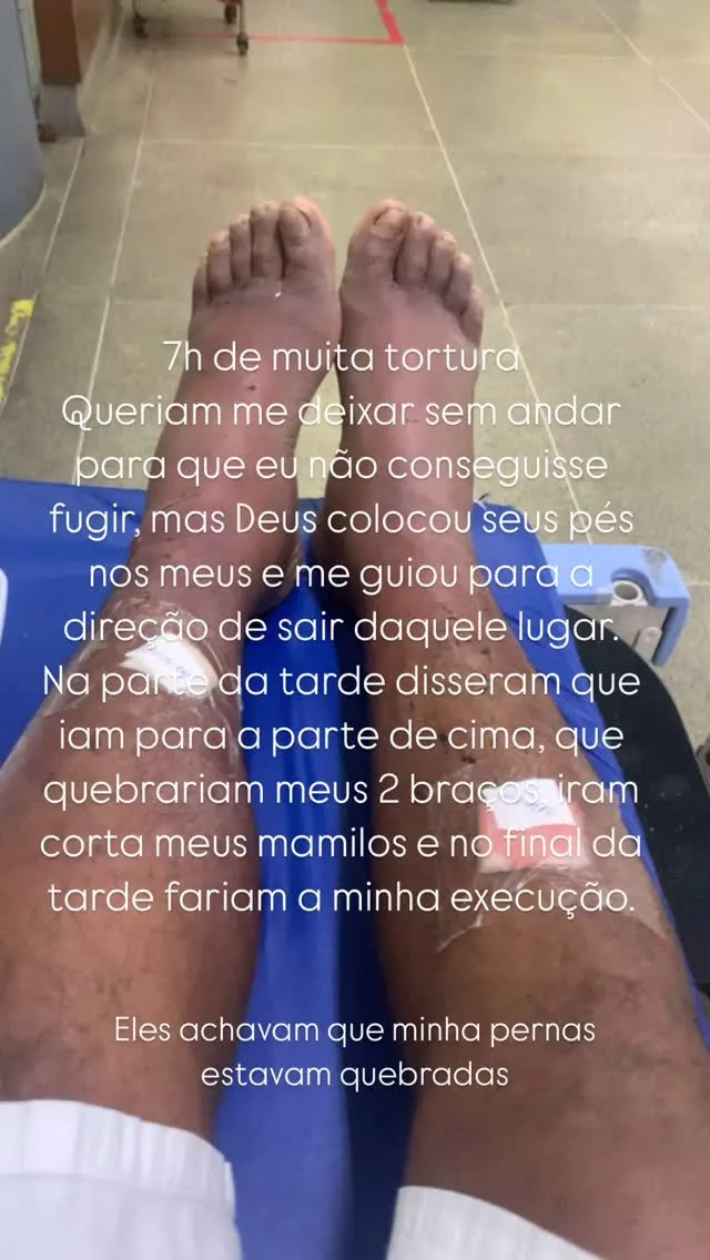 Em um vídeo, também divulgado nas redes sociais, ele mostra as pernas e pés cheios de marcas das agressões, com hematomas e inchaços visíveis, além de relatar o plano dos agressores para sua execução.