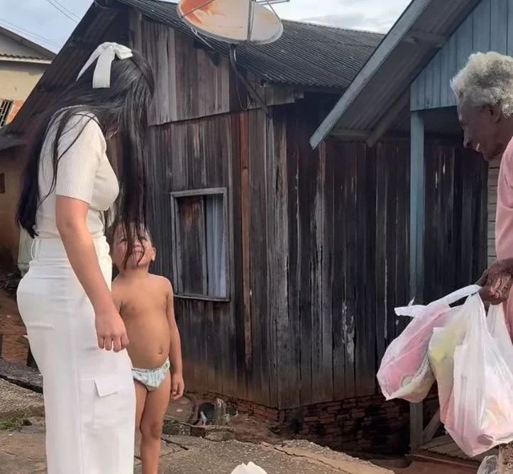 Em um vídeo publicado nas redes sociais, ela aparece entregando cestas básicas, carne e presentes para crianças a uma família em situação de vulnerabilidade
