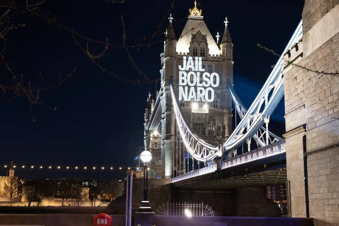 A projeção “Jail Bolsonaro” iluminou a Tower Bridge, em Londres, em manifestação contra o ex-presidente brasileiro/Foto: Reprodução Redes Sociais