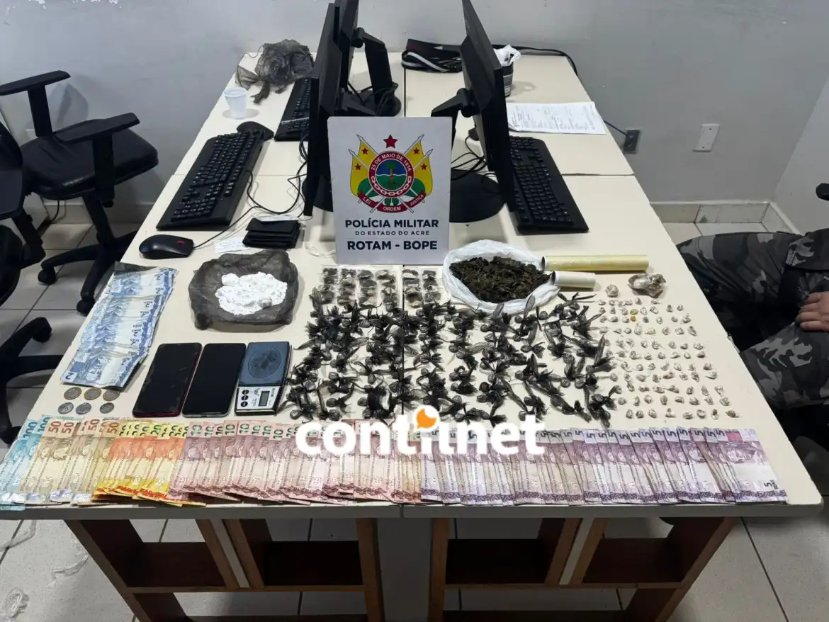 Com os acusados, foram apreendidas 24 trouxinhas de maconha e mais 190 gramas da droga, 88 pedras de crack e 5 pedras maiores (totalizando 80 g), 102 trouxinhas de cocaína e um saco maior da substância (totalizando 160 g), além de uma balança de precisão, material para embalo e R$ 1.100,00 em dinheiro, proveniente da venda dos entorpecentes.