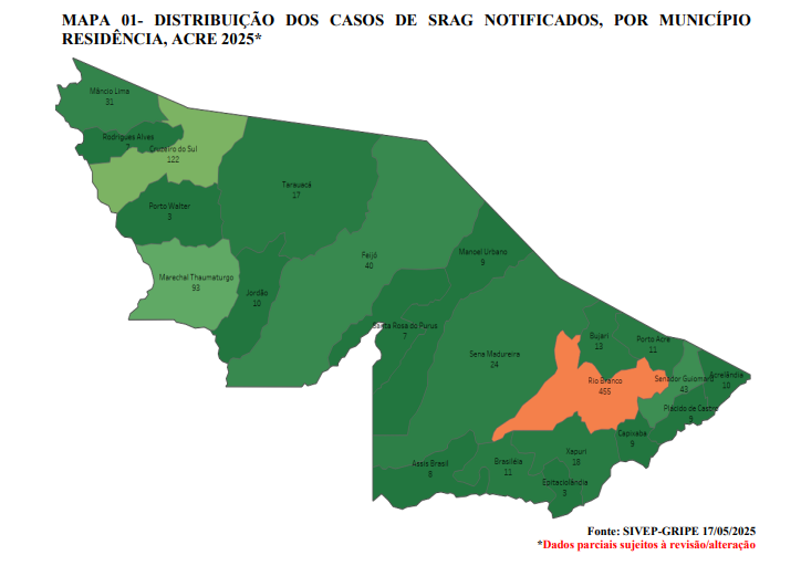 A maioria dos registros foi concentrada nos municípios de Rio Branco, que lidera com 455 casos, e Cruzeiro do Sul, com 122 internações.
