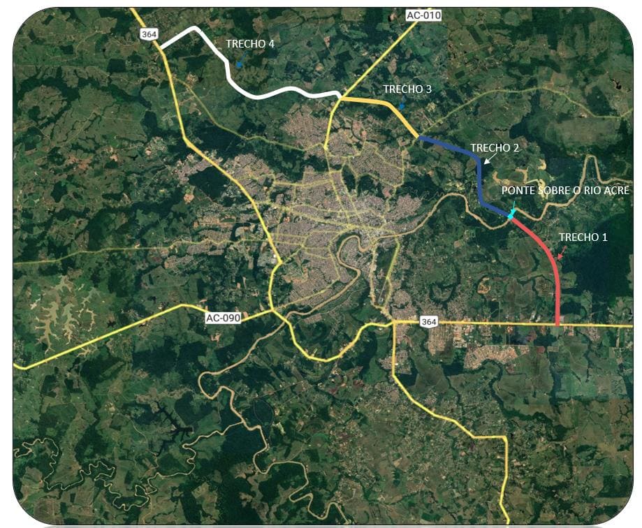 A execução da primeira fase da obra será dividida em três lotes distintos. O primeiro lote contempla a construção e pavimentação de um trecho de 4,1 km, conectando a Estrada do Quixadá à Rodovia AC-010. Já o segundo trecho prevê a ligação entre a ponte sobre o Rio Acre e a Estrada do Quixadá, com extensão superior a 6,2 km. Por fim, o lote quatro se refere à implantação do segmento entre a BR-364, nas proximidades da Subestação de Rio Branco, até a ponte sobre o Rio Acre, totalizando pouco mais de 6,1 km.