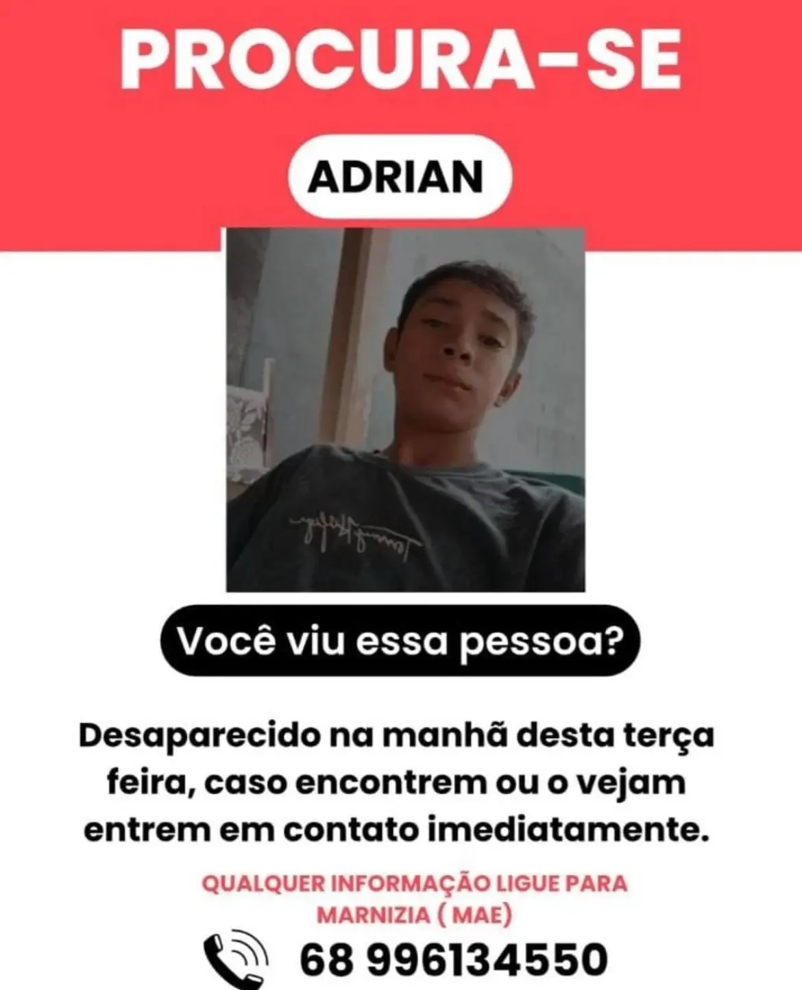 A família do adolescente Adrian, morador do município de Mâncio Lima, no interior do Acre, está em busca de informações sobre seu paradeiro. O jovem desapareceu na manhã desta terça-feira (3), e desde então não foi mais visto.