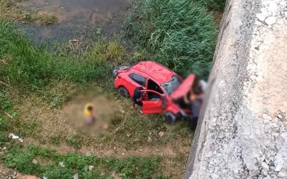 Imagens de uma câmera de segurança registraram o momento exato em que o caminhão faz zigue-zague em uma ponte e acaba atingindo um carro que é arremessado para fora.