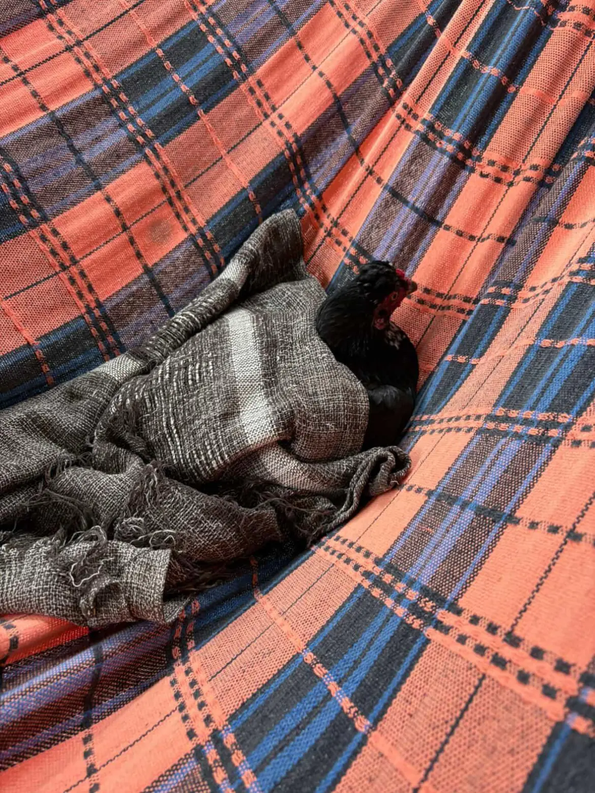 Uma galinha foi vista sendo embalada em uma rede como se fosse um bebê, balançando suavemente / Cedida
