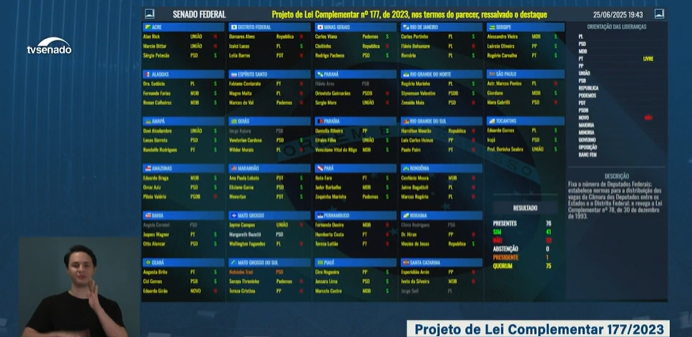 Durante a sessão desta quarta-feira (25), o Senado Federal aprovou, por 41 votos a 33, o Projeto de Lei Complementar nº 177/2023, que prevê a ampliação do número de cadeiras na Câmara dos Deputados a partir da próxima legislatura, em 2027. A proposta eleva de 513 para 531 o total de parlamentares federais e atualiza os critérios de distribuição das vagas entre os estados e o Distrito Federal, considerando os dados populacionais mais recentes. A antiga Lei Complementar nº 78, de 1993, será revogada.
