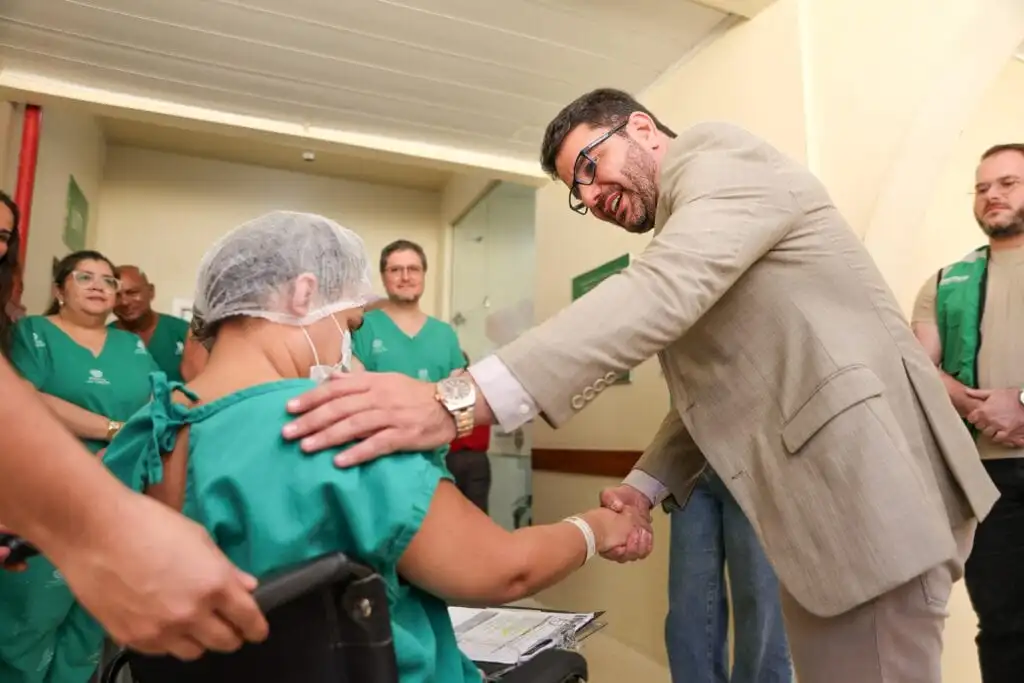 Governador Gladson Camelí cumprimentou terceira paciente a entrar para o transplante. Foto: José Caminha/Secom