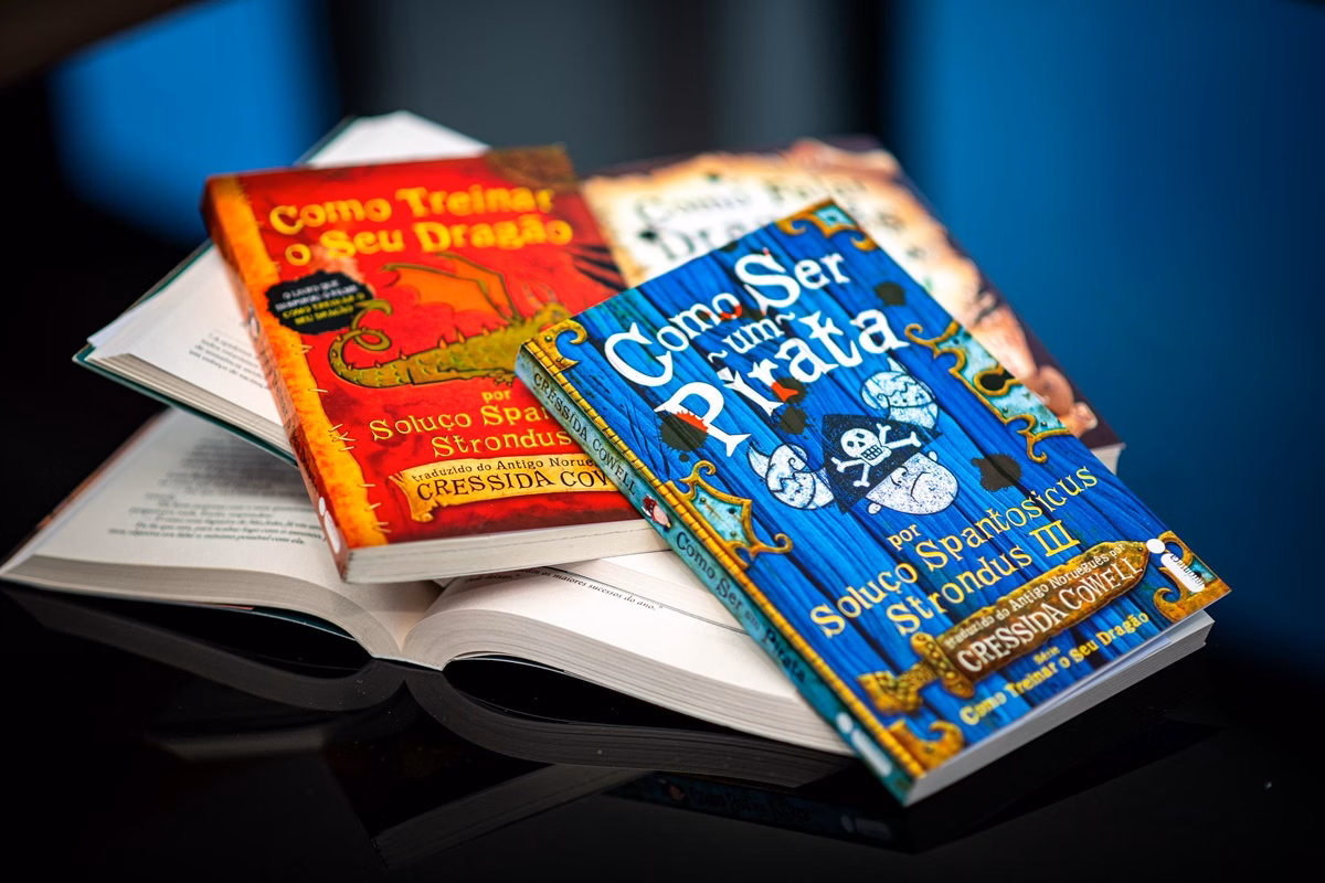 Livro Como Falar Dragonês (Ed. Intrínseca), de Cressida Cowell Capas dos livros da Editora Intrínseca Fotos: Hugo Barreto/Metrópoles @hugobarretophoto