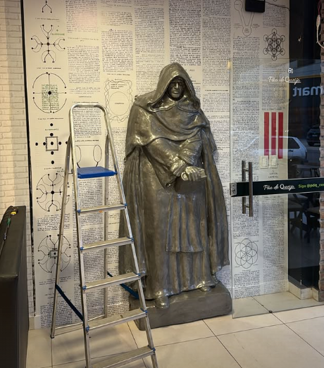 O espaço agora abriga a estátua em tamanho real do pensador renascentista, posicionada em um local onde os clientes podem se aproximar e registrar fotos. Também estão expostas algumas das mensagens que Bruno deixou escritas à mão em livros numerados, que integravam o ambiente do quarto onde ele vivia antes do desaparecimento.