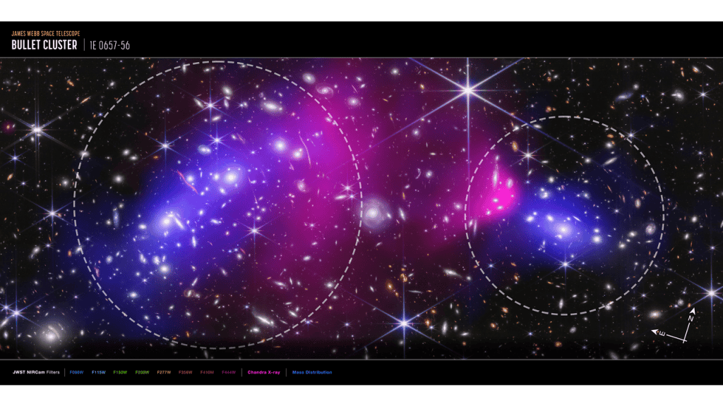 Uma imagem produzida em conjunto entre o Telescópio Espacial James Webb (JWST) e o Observatório de Raios X Chandra, ambos da NASA, revela novos detalhes sobre uma região impressionante do Universo: o Aglomerado Bala (1E 0657-56) – uma colisão violenta entre dois grupos enormes de galáxias.