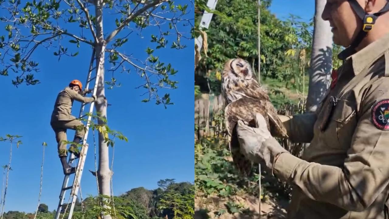 Uma coruja foi resgatada por uma equipe do Corpo de Bombeiros do Acre na tarde desta quarta-feira (23), no bairro Cidade Nova, em Rio Branco. O animal estava pendurado de cabeça para baixo em uma árvore, preso por uma linha com cerol — material cortante utilizado ilegalmente em pipas.