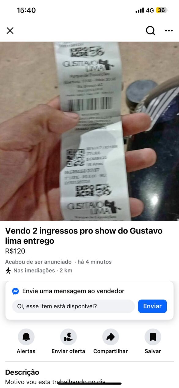 Um dos anúncios diz o seguinte: ” Vendo ingressos Expoacre 2025 sem fila! Tá sem tempo pra pegar fila trocando alimento? Eu resolvo pra você!”, diz em tom bem humorado.