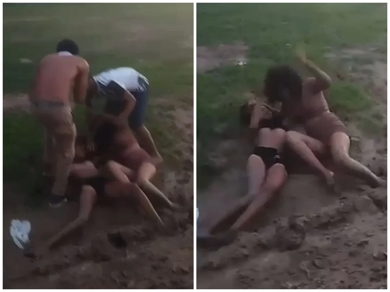 Em determinado momento, uma das mulheres é contida, mas consegue desferir um chute no rosto da adversária, que cai no chão, suja de lama e visivelmente desolada. A gravação evidencia a mistura de agressividade e falta de controle, com espectadores divididos entre intervir e assistir.