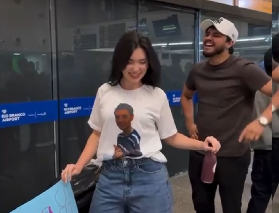 Com açaí e camiseta personalizada, Rogeria Rocha surpreende noivo no aeroporto de Rio Branco. Foto: Reprodução