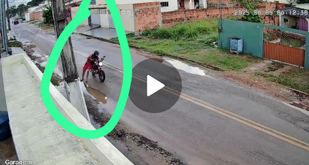 Imagens registradas por uma câmera de segurança de uma residência mostram o exato momento em que o homem perde o controle ao passar pela poça formada por água da chuva acumulada sobre o asfalto. Devido à alta velocidade, a moto aquaplanou e o condutor caiu na pista.