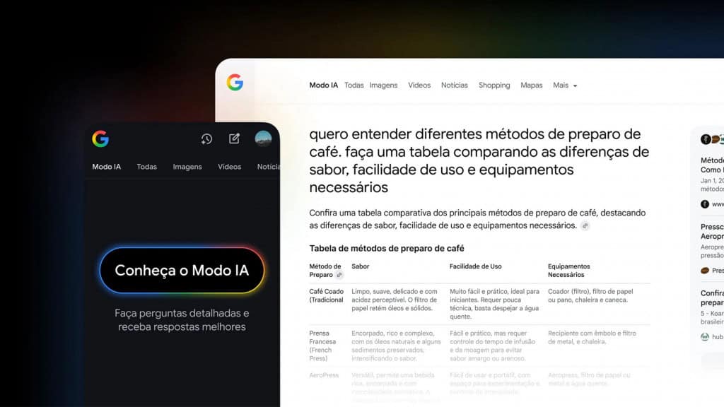 Para demonstrar, o Google sugeriu a consulta: “Quero entender diferentes métodos de preparo de café. Faça uma tabela comparando diferenças de sabor, facilidade de uso e equipamentos necessários.”