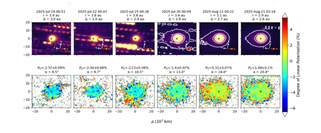 Além das imagens e análises espectroscópicas que revelaram sua coloração verde e composição química, os pesquisadores recorreram à polarimetria. Essa técnica estuda como a luz, ao ser espalhada por partículas, se organiza em diferentes direções. O processo pode fornecer informações sobre o tamanho, a forma e a orientação dos grãos de poeira que circundam um cometa.