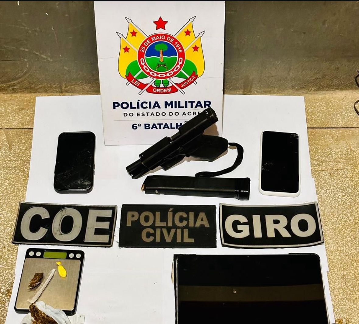 No imóvel, foram apreendidos uma arma de fogo, drogas (maconha e cocaína), uma balança de precisão, celulares, um tablet e dinheiro em espécie.