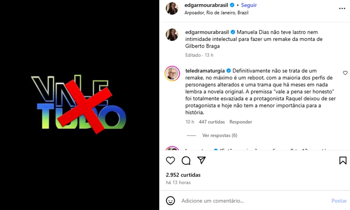 Edgar Moura Brasil, viúvo do autor Gilberto Braga, compartilhou uma postagem nas redes sociais criticando o trabalho de Manuela Dias no remake de Vale Tudo. A novela original foi escrita por Braga em 1988 e a obra de Manuela vem sofrendo com críticas nas redes justamente por não se assemelhar à versão original, muito elogiada pelo público.