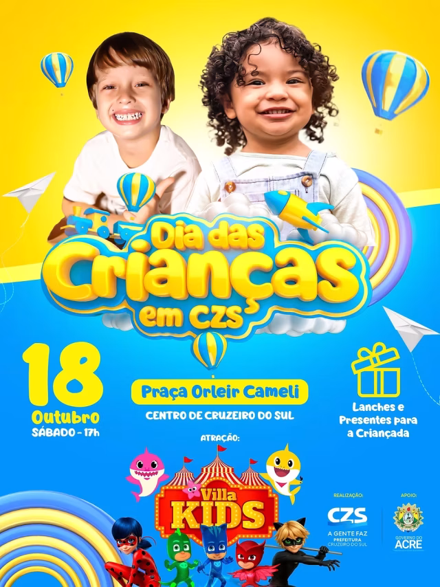 Uma grande festa em celebração ao Dia das Crianças será realizada no próximo sábado, 18 de outubro, na Praça Orleir Cameli, no centro de Cruzeiro do Sul. O evento, com o apoio do Governo do Estado e organizado pela prefeitura municipal, terá início às 17h e contará com diversas atrações para o público infantil.