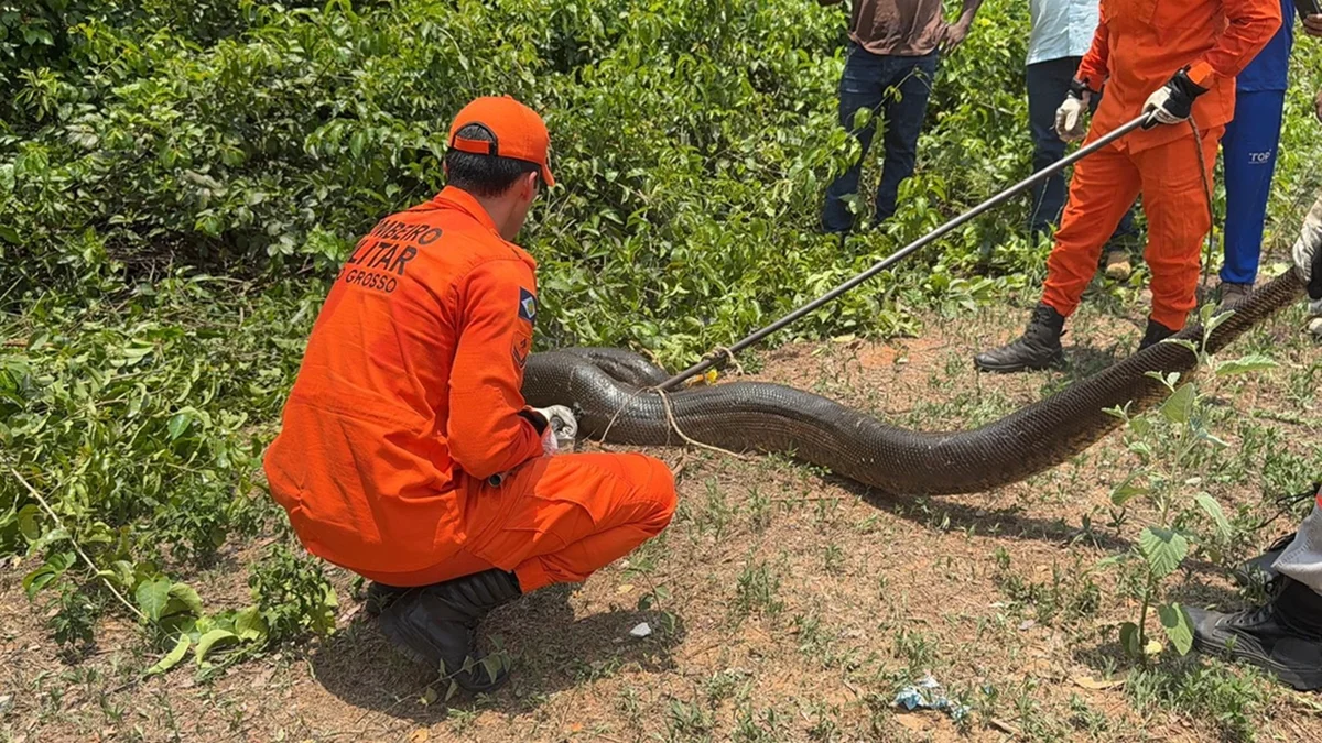 De acordo com os bombeiros, a serpente não demonstrava comportamento agressivo e foi encontrada próxima a um córrego, possivelmente em busca de abrigo ou alimento.