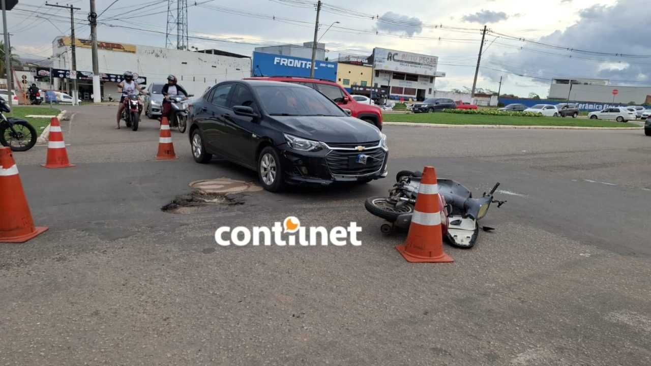 Um acidente entre um Chevrolet Onix Sedan preto e uma motocicleta Honda Biz vermelha deixou o motociclista Anderlei de Lima, de 36 anos, ferido na tarde desta sexta-feira (17), na Avenida Ceará, no bairro Tangará, em Rio Branco.