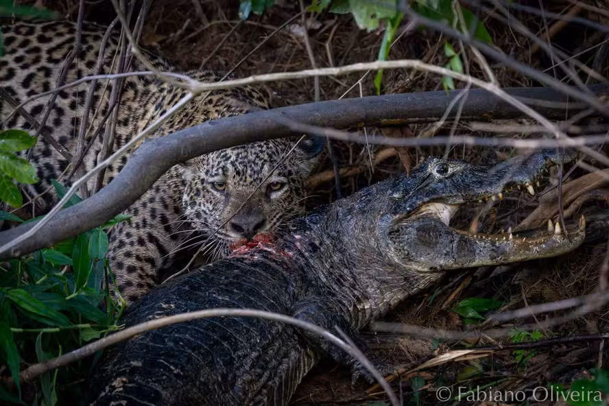 O fotógrafo relatou que o flagrante começou após um aviso pelo rádio de que uma onça havia sido vista em caça. — A gente ouviu no rádio que tinha uma onça caçando e fomos para essa região. Todos os barcos são interconectados por rádio. Ao chegar lá, vimos que ela estava subindo em um tronco. De lá, pulou direto nesse jacaré, que a gente nem tinha visto, porque era uma região coberta por água e vegetação. Daqui a pouco, ela emergiu da beira do rio com esse jacaré enorme — relatou.