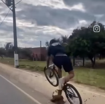 Um vídeo que circula nas redes sociais mostra um momento inusitado envolvendo um ciclista e uma galinha. Nas imagens, o rapaz aparece empinando a bicicleta com apenas uma perna quando o animal cruza repentinamente a pista, provocando o desequilíbrio e a queda.
