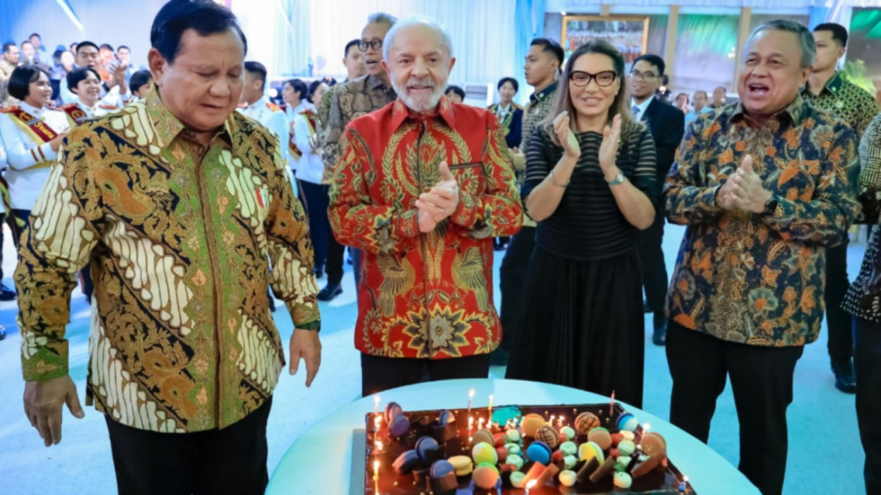 Durante um banquete oficial realizado no Palácio Presidencial Merdeka, em Jacarta, o presidente Luiz Inácio Lula da Silva (PT) foi homenageado com uma comemoração antecipada pelos seus 80 anos, que serão completados na próxima segunda-feira (27). A celebração ocorreu na noite desta quinta-feira (23), durante viagem oficial à Indonésia, e contou com a presença do presidente indonésio, Prabowo Subianto, anfitrião do evento.