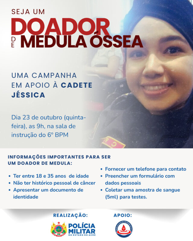 A Polícia Militar do Estado do Acre realiza, nesta quinta-feira, 23 de outubro, uma campanha de doação de medula óssea em apoio à cadete Jéssica Moura, que enfrenta uma batalha contra a leucemia. A ação acontece a partir das 9h, na sala de instrução do 6º Batalhão de Polícia Militar (BPM), em Cruzeiro do Sul, com apoio do Hemonúcleo do município.