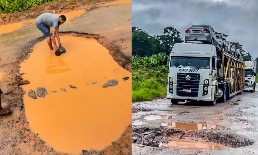 O caminhoneiro Arlisson Rocha, que atua no transporte de veículos entre as duas cidades, compartilhou vídeos da viagem e relatou os prejuízos acumulados com os danos causados pela estrada.