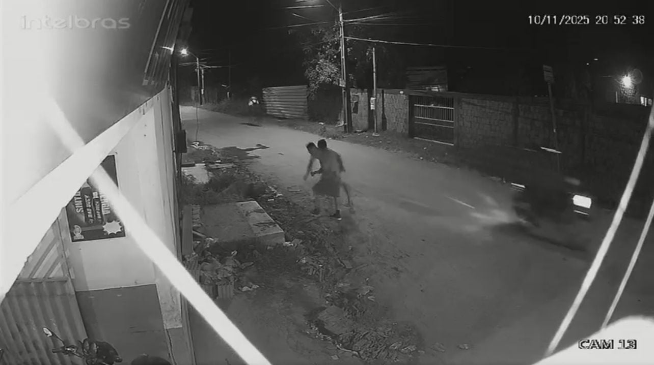 Imagens de câmeras de segurança mostram o instante em que dois homens em uma motocicleta se aproximam do local. O garupa saca uma arma e realiza vários disparos em direção às vítimas, que estavam conversando em frente ao estabelecimento do comerciante.