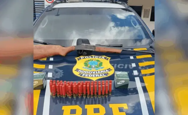 Durante a abordagem, os policiais encontraram uma espingarda e munições dentro do veículo. Ao ser questionado, o motorista informou que a arma pertencia ao pai dele, mas o registro não estava em seu nome, o que caracteriza irregularidade.