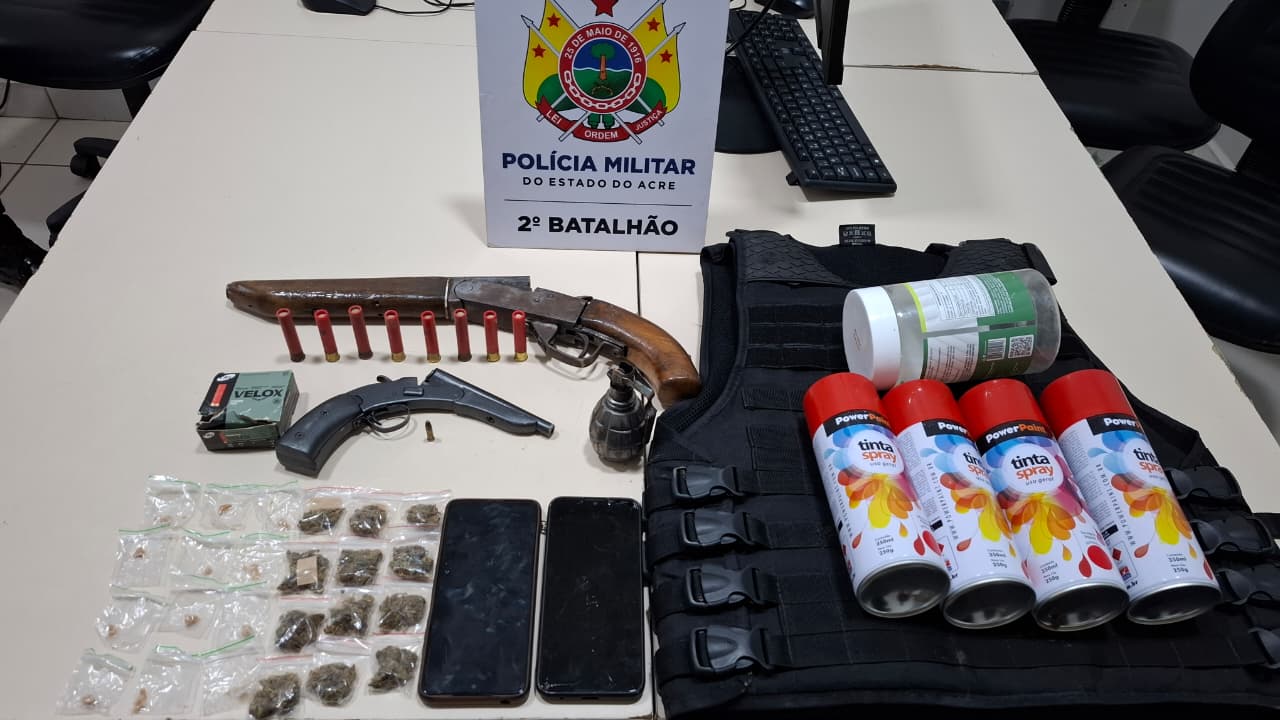 Durante a continuação da abordagem, os policiais entraram na residência onde ele estava. No interior do imóvel, Wesley foi encontrado e também abordado. Nas buscas, a equipe apreendeu uma segunda arma de fogo, diversas munições, porções de drogas, um colete balístico e um artefato explosivo semelhante a uma granada.