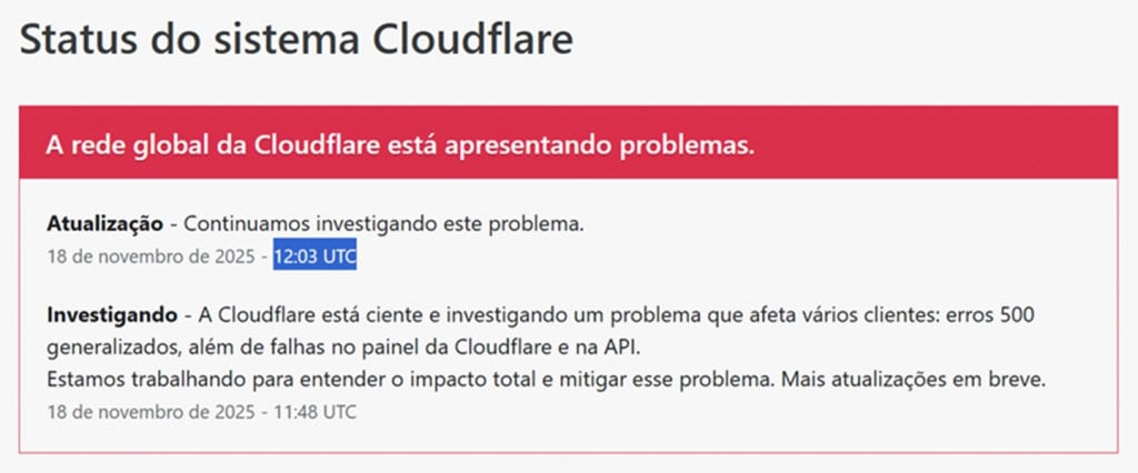 A Cloudflare mantém uma página de status, por onde atualiza o funcionamento de seus servidores. A empresa escreveu que se trata de um erro generalizado que está afetando vários clientes.