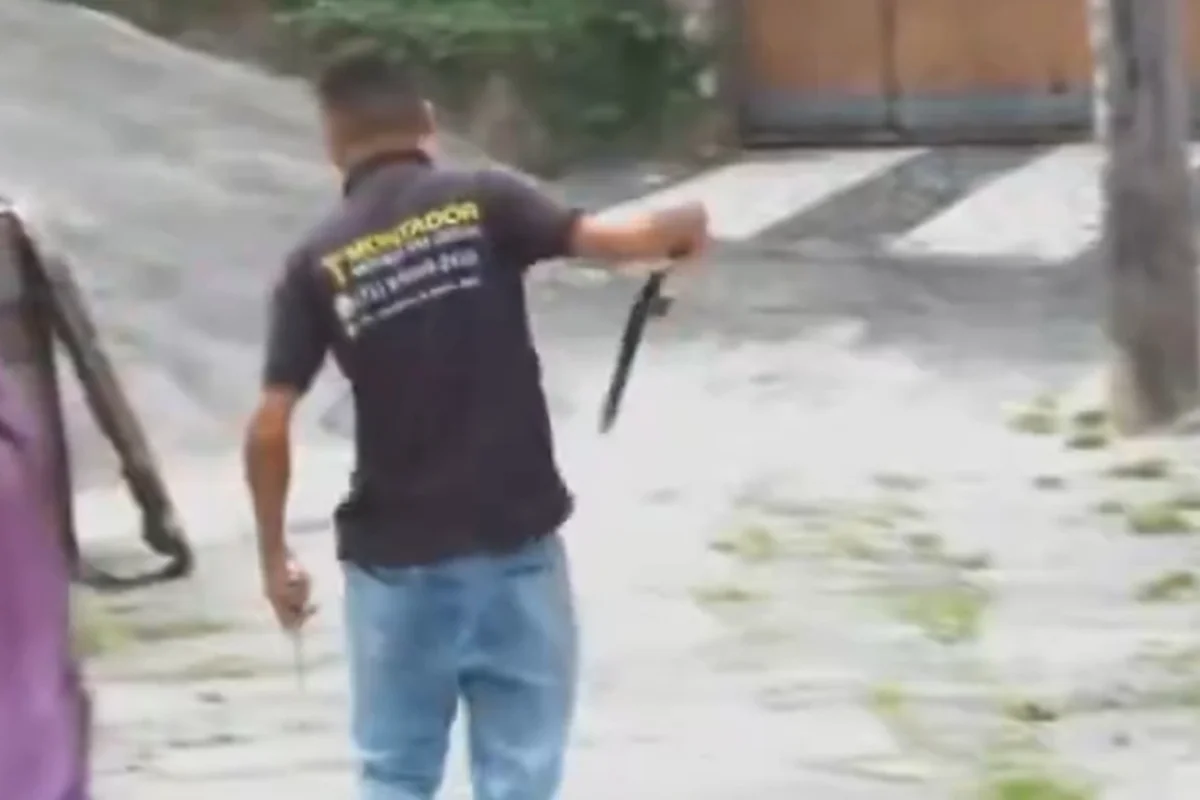 Durante a discussão, o homem saca uma faca e aponta o objeto para ela. A equipe da TV, visivelmente assustada, intervém imediatamente e pede que ele se afaste.